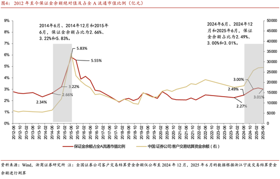 同样地,我们用保证金余额占全A流通市值的比例变动衡量股票市场增量资金的流入速度。1)2014-2015年“流动性牛市”:2014年6月、2014年12月和2015年6月,保证金余额占比为2.66%、3.22%和5.83%,边际变化分别为0.56%和2.61%,边际变化幅度较大。2)本轮 “系统性‘慢’牛”行情:2024年6月、2024年12月和2025年6月,保证金余额占比为2.49%、3.00%和3.01%,边际变化分别为0.51%和0.003%,尤其是2024年12月-2025年6月,边际变化幅度较小。