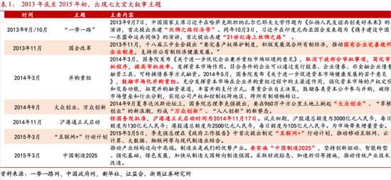 2014-2015年“流动性牛市”启动前后,七大“宏大叙事”催化,推动指数上行,形成“快牛”行情。2013年四季度至2015年一季度的近6个季度中,出现“一带一路”、国企改革、并购重组、“大众创业、万众创新”、沪港通开通、“互联网+”和“中国制造2025”等主题,或为国家领导人首次提出,或为国务院、重要会议(十八届三中全会、全国两会)发布或提到,具有“宏大叙事”的特征。在流动性充沛、市场做多情绪背景下,宏大叙事的出现或推动指数快速上行,形成“快牛”行情。