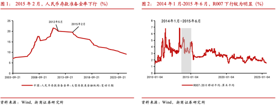 央行宣布,自2015年2月5日起,下调金融机构人民币存款准备金率0.5个百分点,同时对符合定向降准的城市商业银行、非县域农村商业银行额外降0.5个百分点。值得注意的是,这是继2012年5月之后,时隔近三年来央行首次启动全面降准,政策转向明显。根据图2, R007 20MA从2014年1月初的5.4%下降到2015年6月底的2.5%左右,下降幅度较大。宽松货币政策为市场提供流动性。