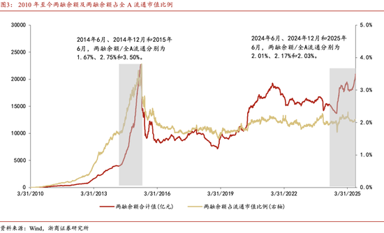 两融余额和保证金余额对市场走势相对敏感,我们用两融余额和保证金余额合计值占全A流通市值的比例变动衡量股票市场增量资金的流入速度。1)2014-2015年“流动性牛市”:2014年6月、2014年12月和2015年6月,该项指标为4.3%、6.0%和9.3%,边际变化分别为1.6%和3.4%。2)本轮 “系统性‘慢’牛”行情:2024年6月、2024年12月和2025年6月,该项指标为4.4%、5.2%和5.0%,边际变化分别为0.8%和-0.1%。边际变化表明2014-2015年增量资金流入速度较快。